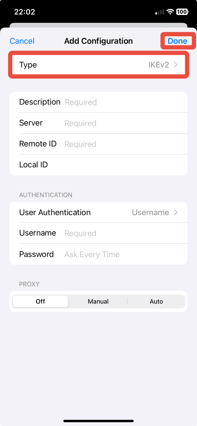 - Select the type of your VPN and return to fill in the details