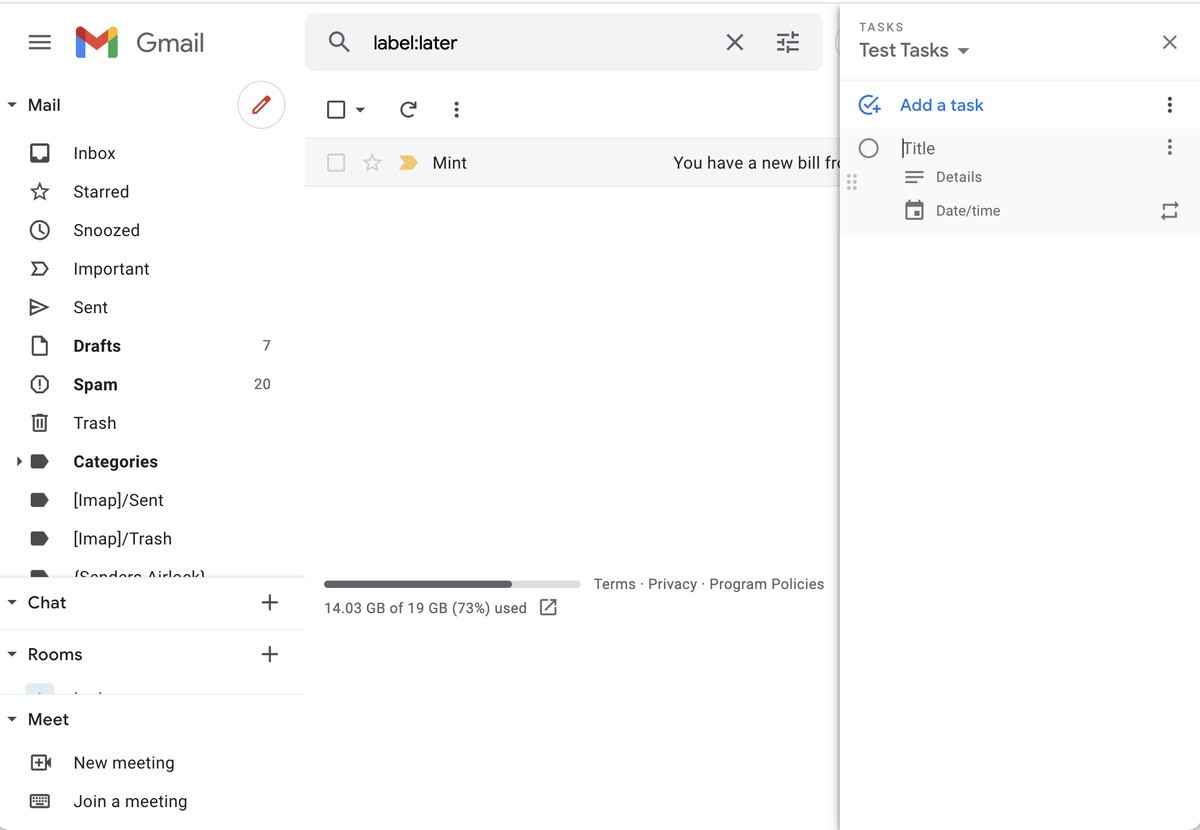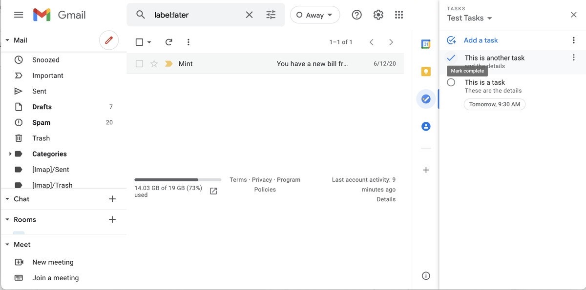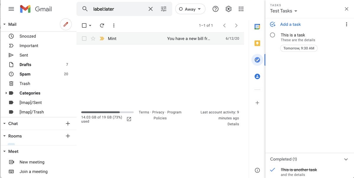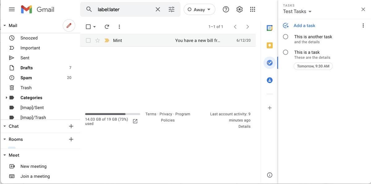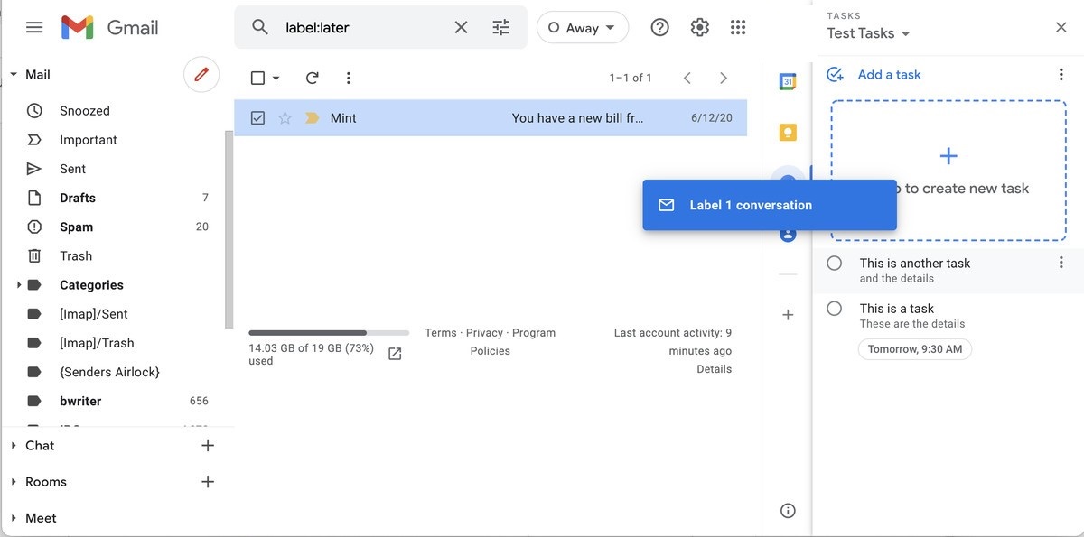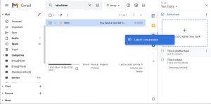 Google’s Tasks app functions like a digital to-do list. While there are dedicated Android and iOS apps for Tasks, it’s also integrated right into the inbox view when you’re using Gmail on a desktop. So it can be a handy way of keeping track of items while you go through your email in case you need to remember to reply to an email later or need to be able to access a message quickly.